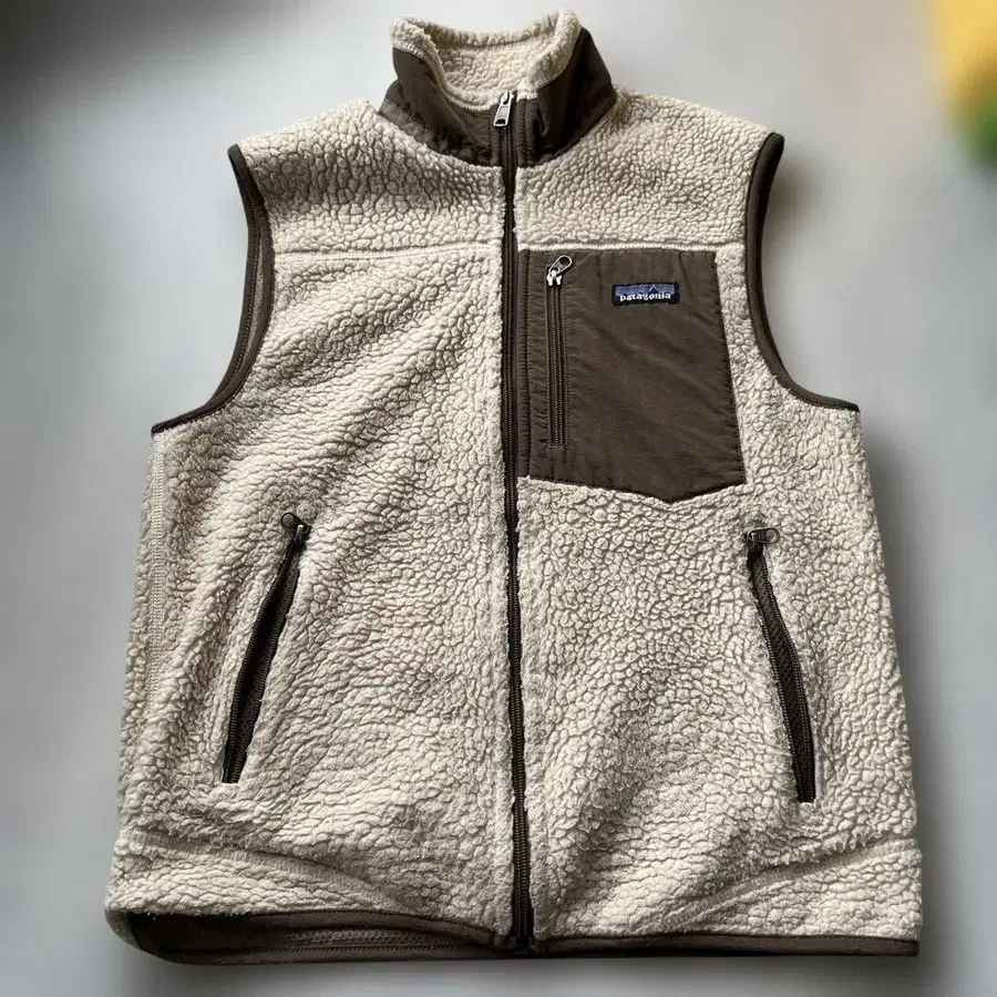 파타고니아 Patagonia의 플리스 집업 베스트, 베이지와 브라운 배색으로, 스탠드 카라와 프론트 포켓이 있습니다.