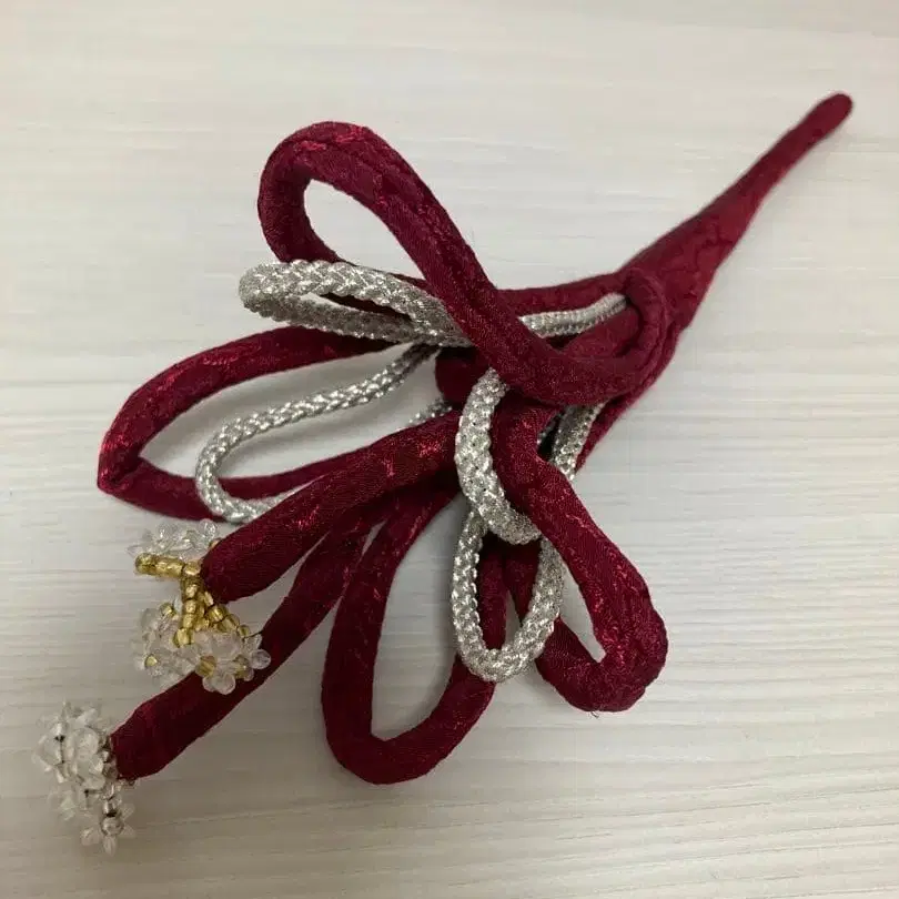 와인 레드 색상의 패브릭 소재로, 꽃 모양의 오비 장식 비즈와 금장 장식이 달려 있습니다.