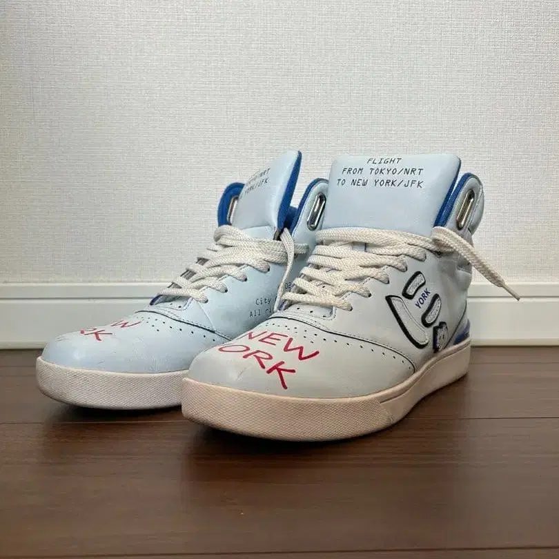 SANGACIO 뉴욕 콜라보 뉴욕 스니커즈 하이컷 전체적으로 먼지 부착, 얼룩, 착화감 등 사용감이 있는 상품입니다. 직접 닦아낼 수 있는 얼룩이라고 생각합니다. 사이즈 약: 27.0 컬러: 블루