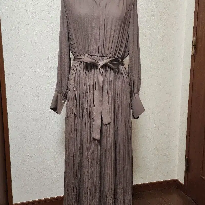 플리츠 가공의 긴팔 롱 원피스, 허리 벨트 포함으로 스타일업. 이미지는 9호 사이즈 토르소 마네킹에 착용한 모습입니다. - 색상: 그레이처럼 보이지만 모카입니다. - 사이즈: 38 슬림한 편이라 S 사이즈 또는 S에 가까운 M 사이즈 분들께 추천합니다. - 기장: 뒷면 카라부터 116cm - 허리: 밴딩 처리되어 있어 늘어납니다. 벨트 포함. - 안감: 있음 방문해 주셔서 감사합니다. 수년 전에 구매하여 한 번 착용한 후 옷장에 보관했던 제품입니다.