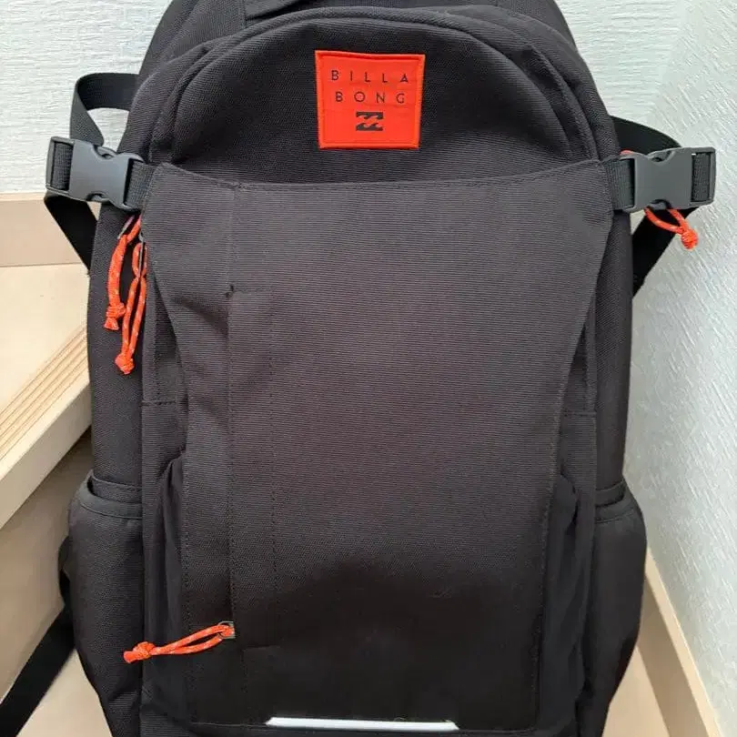 프론트 포켓과 조정 가능한 숄더 스트랩이 있는 중간 크기의 블랙 백팩.