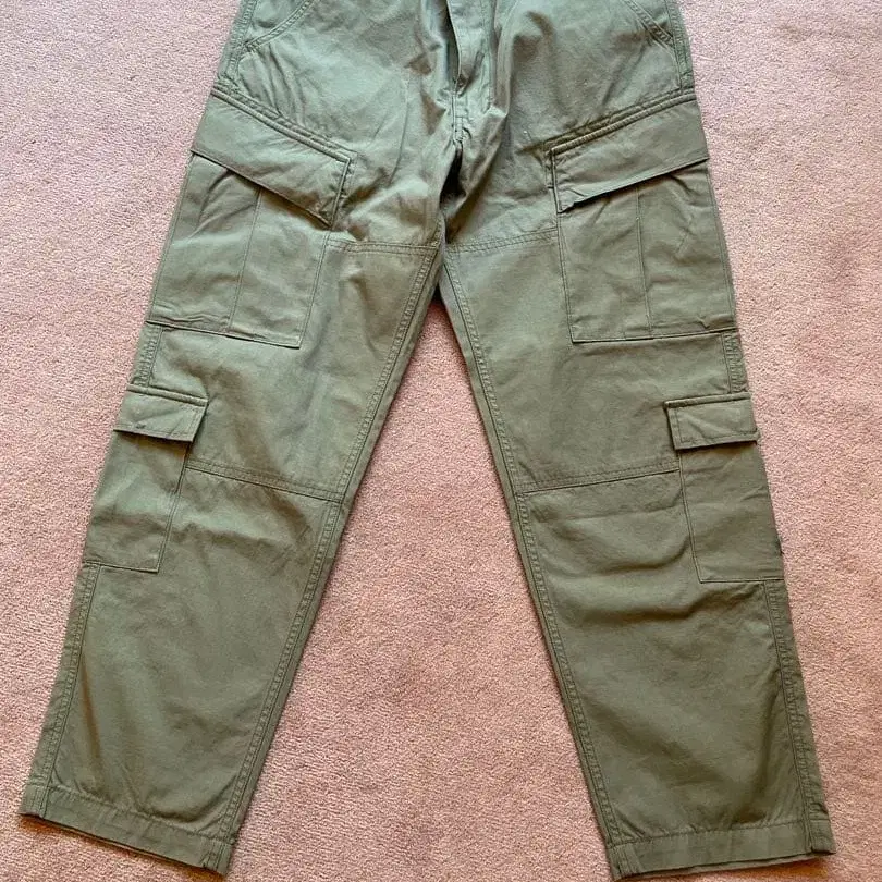 ALPHA INDUSTRIES의 올리브 그린 카고 포켓이 달린 워크 팬츠, 사이즈 M입니다.