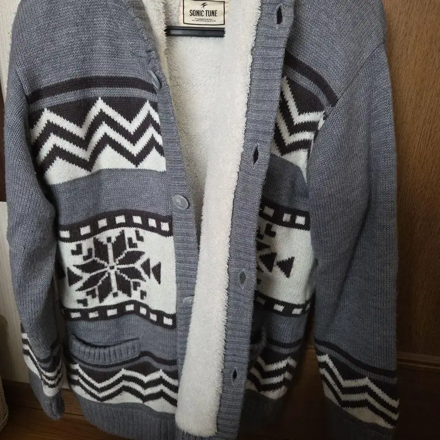 자동 번역되었어요. 원문보기플리스 안감의 그레이 후드 가디건, 눈꽃과 지그재그 무늬 디자인.