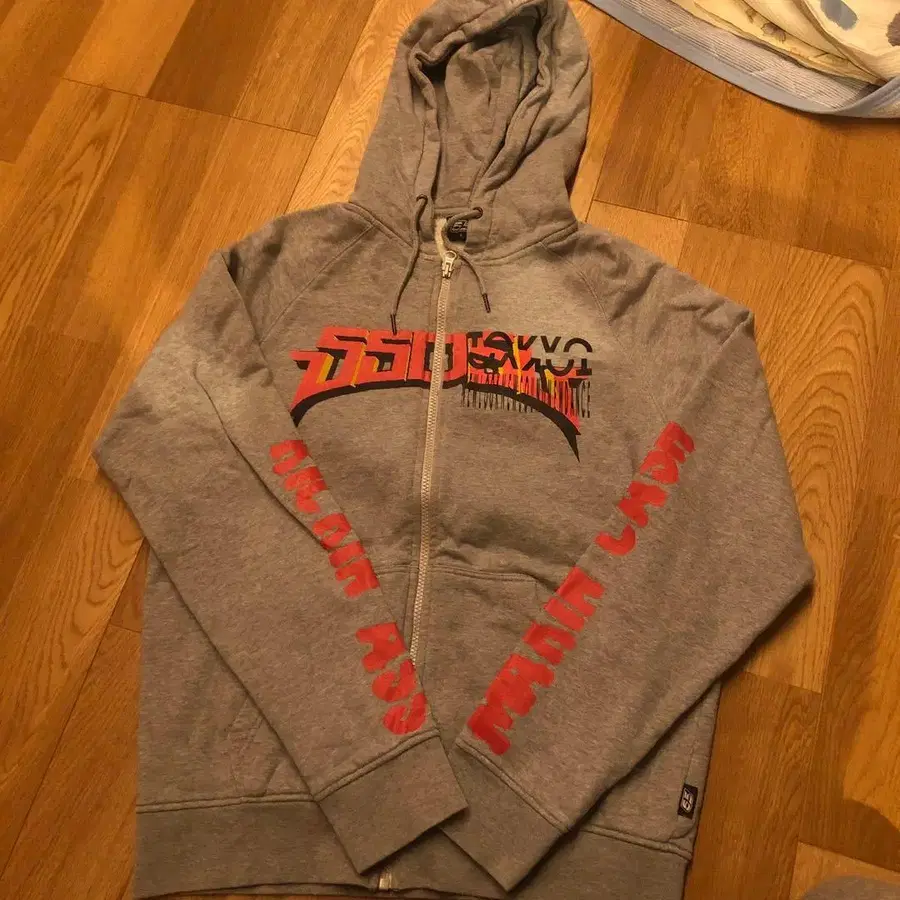 도쿄의 호랑이 프린트가 특징인 그레이 색상의 후드티. - 브랜드: ROCSTAR 55DSL - 사이즈: M - 색상: 그레이 - 디자인: 도쿄 그래픽 프린트 - 특징: 프론트 지퍼, 후드 부착 - 프린트: 호랑이 디자인과 텍스트 - 스타일: 캐주얼 방문해 주셔서 감사합니다.