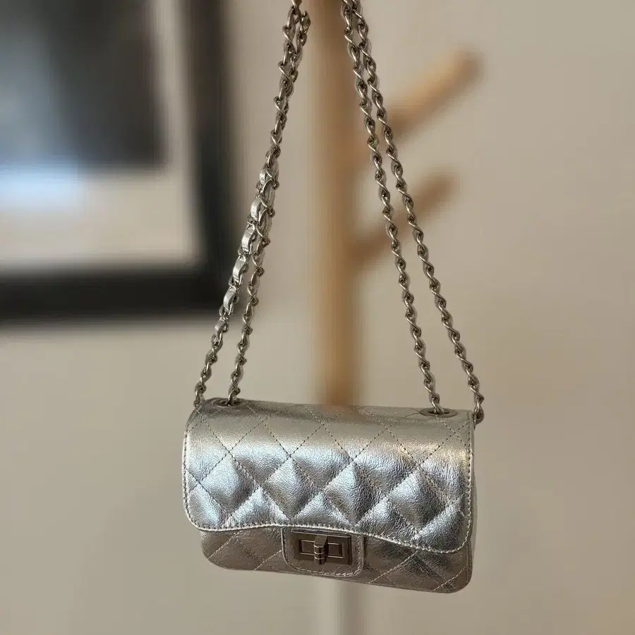 실버 색상의 퀼팅 디자인, 체인 스트랩이 달린 숄더백. 핸드폰과 지갑이 들어가는 크기입니다. - 색상: 실버 - 디자인: 퀼팅 - 스트랩: 체인 스트랩 - 잠금 장치: 금속제 클래스프 - 내부: 지퍼 포켓 방문해 주셔서 감사합니다. 색상 - 실버 계열 소재 - 천연 가죽 얼룩, 찢김 등 - 없음 19 x 12 cm 381 그램