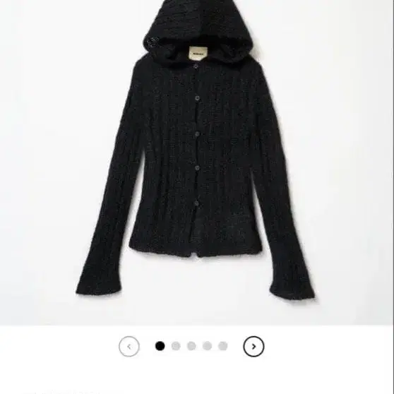 후드 부착 디자인의 리브 니트로, 단추식으로 여미는 블랙 니트입니다.