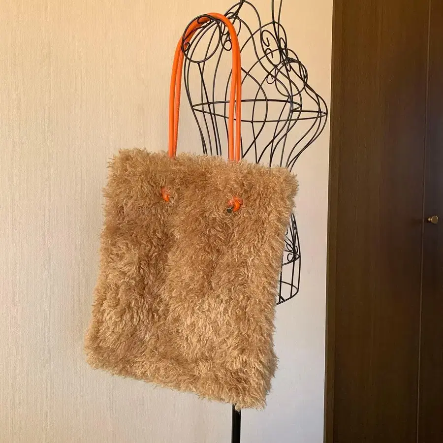 퍼 소재의 베이지 토트백, 오렌지 핸들 포함. 내부 포켓 1개. - 색상: 베이지 - 소재: 퍼 - 핸들 색상: 오렌지 - 특징: 버튼 포함 방문해 주셔서 감사합니다.