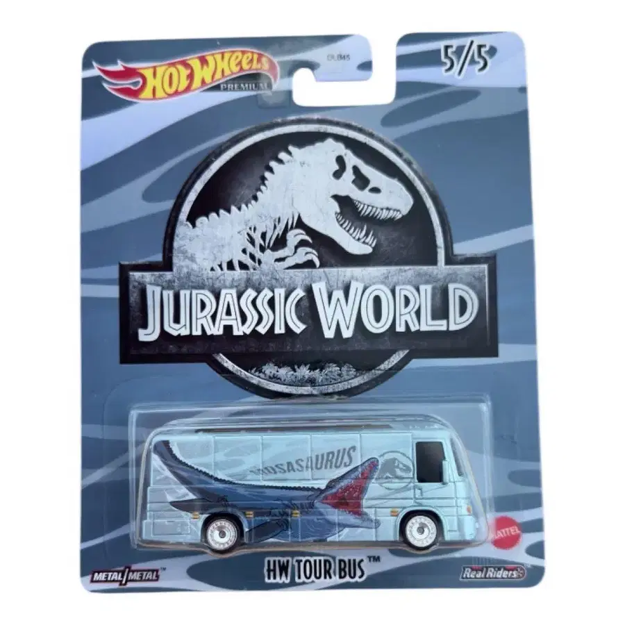 쥬라기 월드 테마의 HW 투어 버스, 메탈 소재에 리얼 라이더 타이어가 장착되어 있습니다.