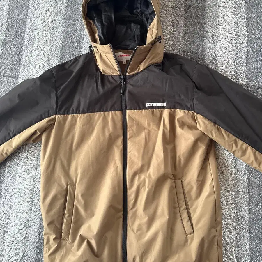 CONVERSE L 사이즈 다운 자켓, 베이지와 블랙의 콤비네이션, 프론트 지퍼와 포켓 부착으로 실용적입니다. - 브랜드: CONVERSE - 사이즈: L - 색상: 베이지/블랙 - 특징: 프론트 지퍼, 포켓 부착 방문해 주셔서 감사합니다. 사이즈 - L