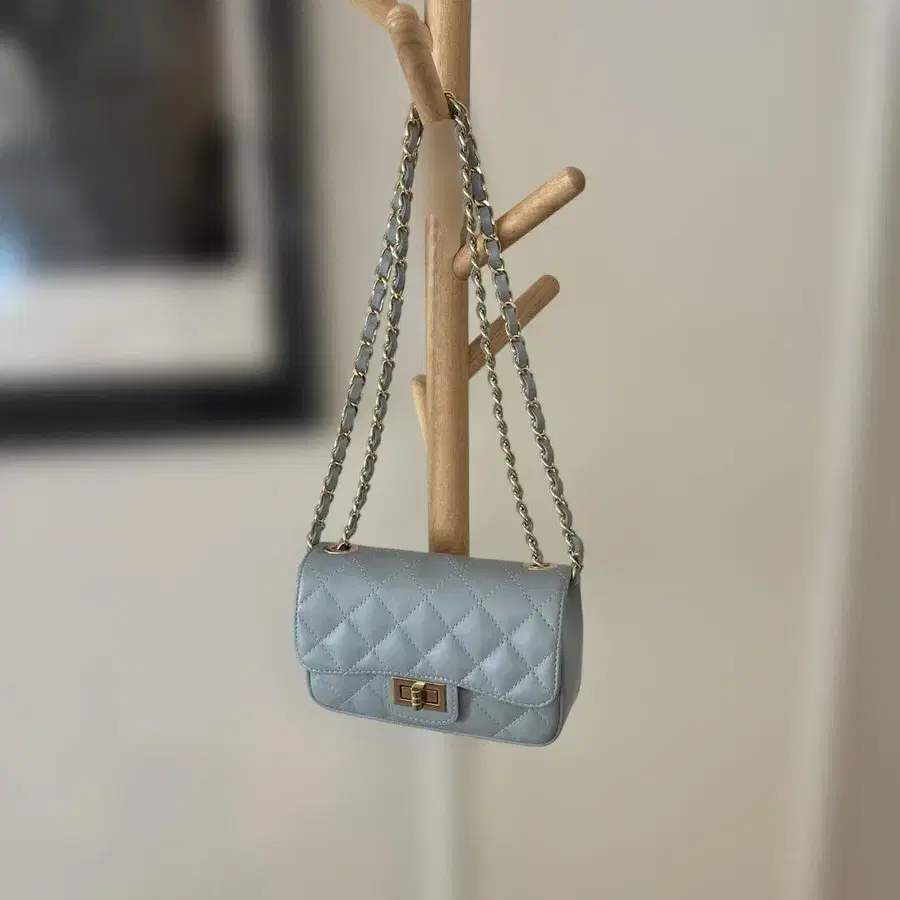 스카이블루 퀼팅 숄더백 거의 미사용품 이탈리아제 천연 가죽