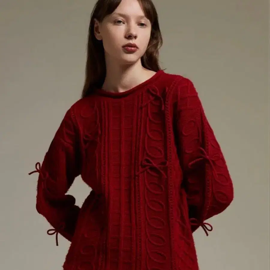 토코 펄 비쥬 장식 빅 리본 절개 리브 니트 원피스 보르도
