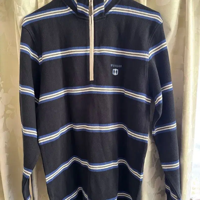 맥그리거 블랙과 파랑 스트라이프 디자인의 하이넥 피케 셔츠. 코튼 100% 구매 후 시착만 하고 집에서 보관했습니다. 세탁 태그 부분을 잘랐습니다. - 브랜드: McGregor - 색상: 블랙/파랑/화이트 스트라이프 - 지퍼: 하이넥 지퍼 - 디자인: 자수 로고 포함 방문해 주셔서 감사합니다.