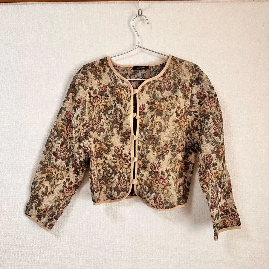 몇 년 전 한 시즌 착용했습니다. - 디자인: 꽃무늬 짜임 - 색상: 베이지 계열 - 스타일: 노카라 - 소매 길이: 긴팔 - 특징: 앞 버튼 개폐 방문해 주셔서 감사합니다. 사이즈 - M