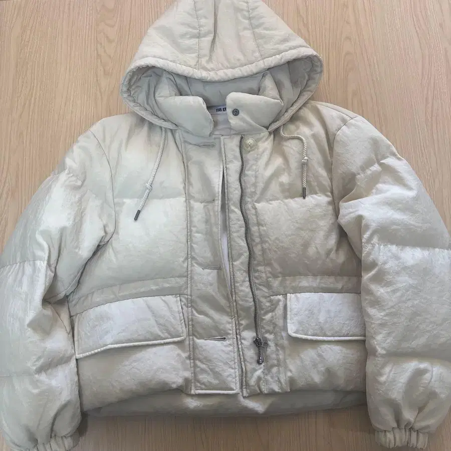 아이보리 후드 부착 다운 자켓, 광택 있는 소재로 스타일리시.