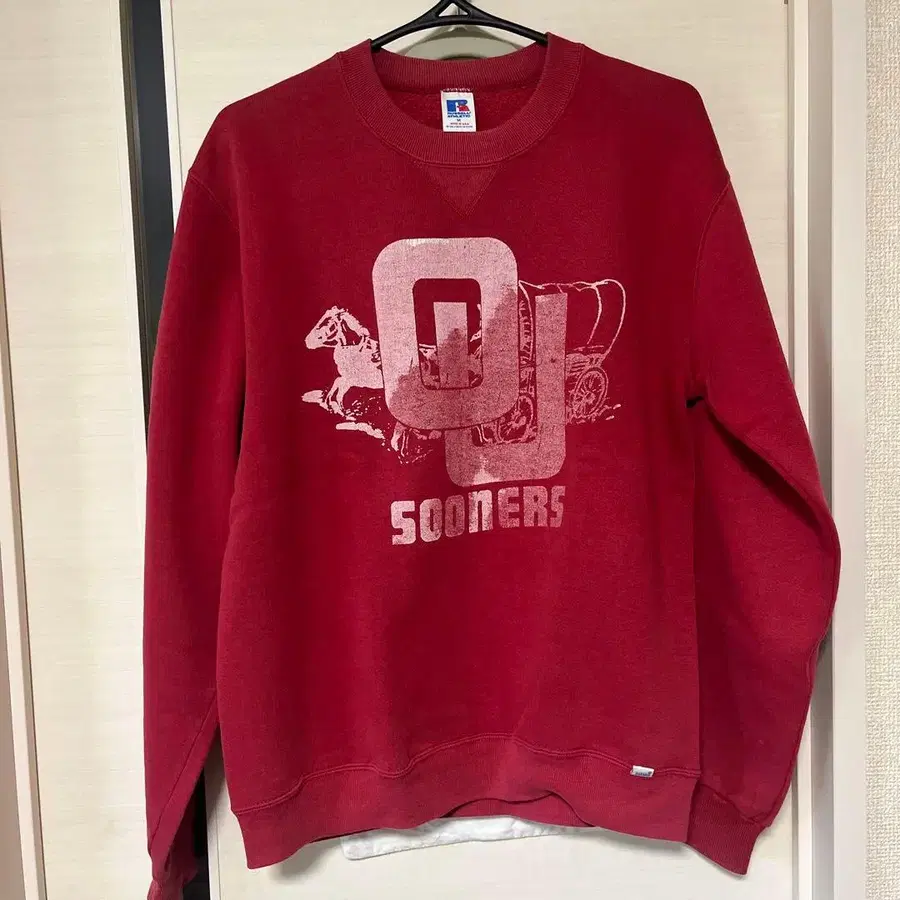 러셀 맨투맨 미국제 빨간색과 크림슨 컬러의 중간색, 앞 V 프린트가 페이드되어 좋은 분위기 원단은 상당히 상태가 좋다고 생각합니다.