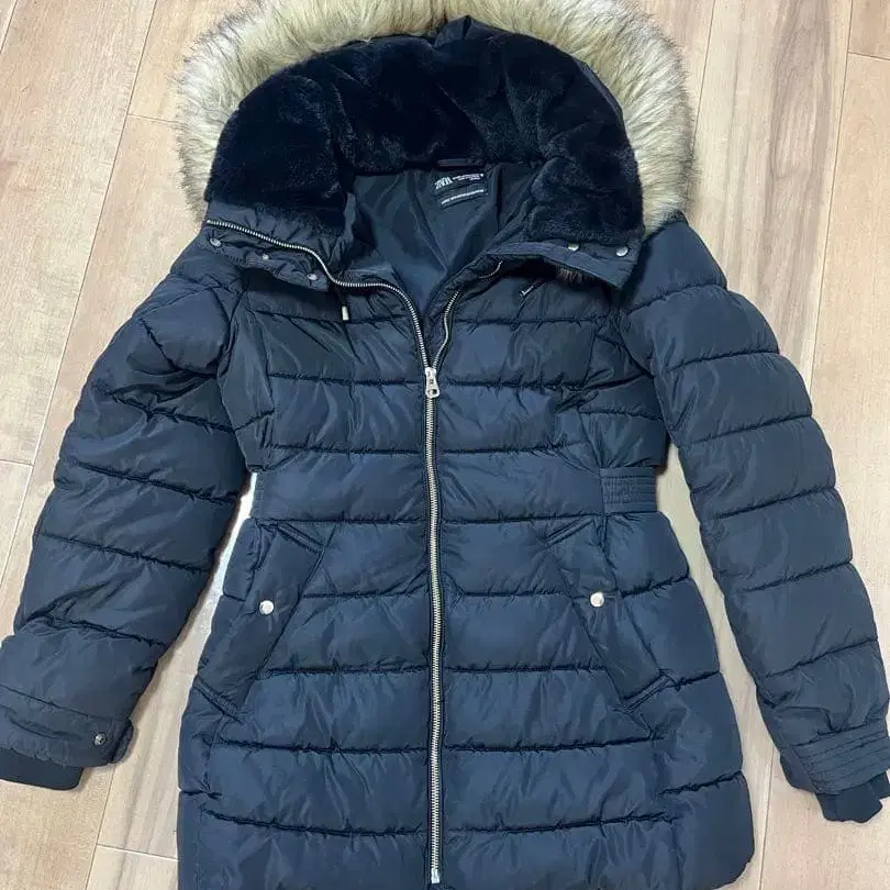 후드에 퍼가 달린 블랙 다운 자켓, 리사이클 폴리에스테르 소재.