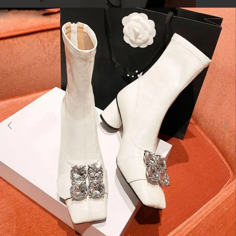 크리스탈 비쥬 장식이 더해진 화이트 힐 부츠, 스타일리시하고 세련된 디자인. 힐 약 6cm 화이트 숏부츠 - 색상: 화이트 - 디자인: 힐 포함, 스퀘어토 - 장식: 크리스탈 장식 - 소재: 합성 피혁 방문해 주셔서 감사합니다.