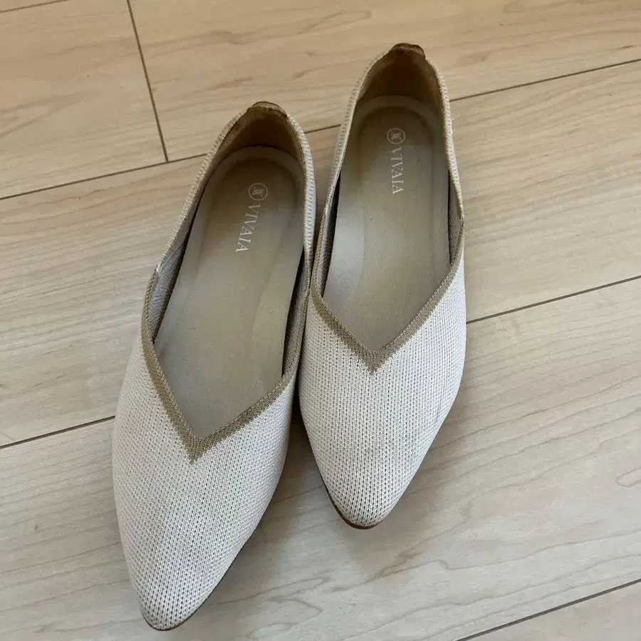 아이보리에 베이지 라인이 악센트로 들어간 플랫슈즈, 슬립온 디자인으로 쾌적한 착용감. 인터넷에 넣고 세탁기로 세탁 가능. 얼룩은 있지만 착용 횟수는 5, 6회입니다. - 브랜드: VIVAYA - 스타일: 플랫슈즈