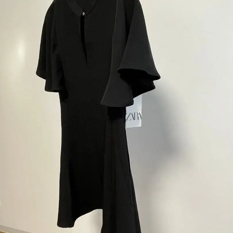 플레어 슬리브 디자인의 블랙 반팔 무릎 기장 원피스로, 심플하고 세련된 스타일입니다.