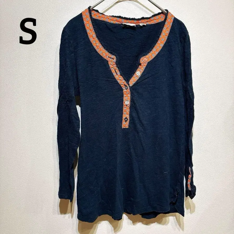 자동 번역되었어요. 원문보기네이비 긴팔 T셔츠, 자수 옷깃과 버튼이 있는 캐주얼 스타일.