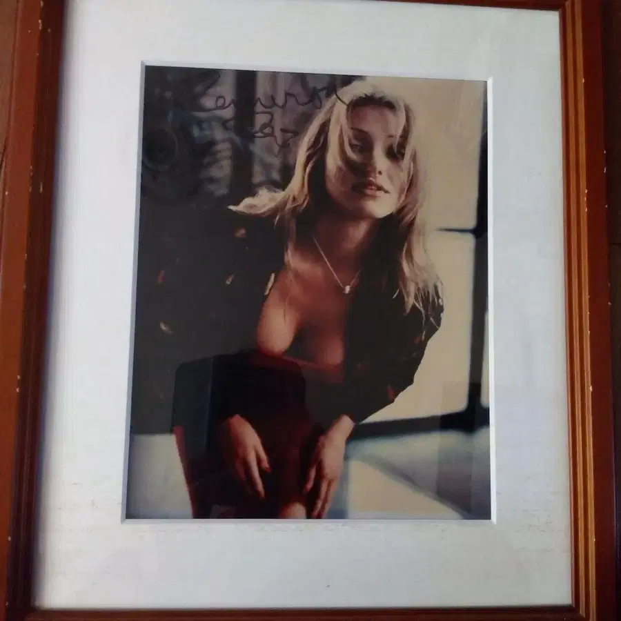 할리우드 여배우 캐머런 디아스의 친필 사인 사진입니다. 액자 부분에 흠집과 얼룩이 있습니다.