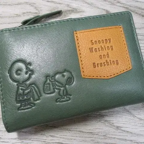 새상품 지갑 여성용 이단 접이 L자 라운드 스누피 천연 가죽 그린!