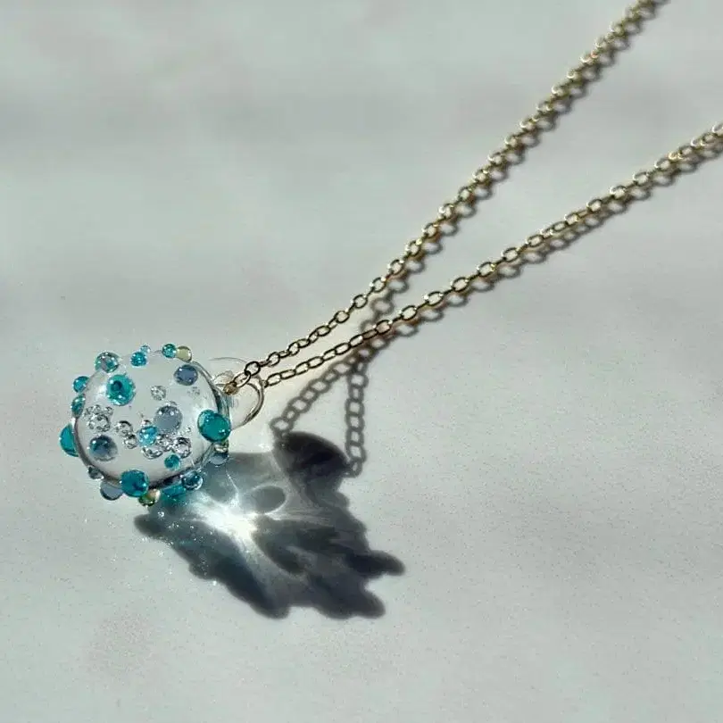 클리어 유리 물방울에 블루 계열 유리로 알갱이를 붙인 목걸이입니다.
