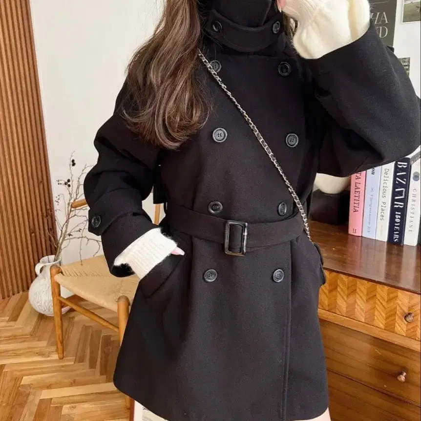 더블 브레스트 디자인의 블랙 코트, 벨트 포함 스타일리시. - 모델: H159 - 색상: 블랙 - 사이즈: M - 특징: 더블 브레스트, 벨트 포함, 하이넥 한 번 시착했으나 저에게 맞지 않아 판매합니다.