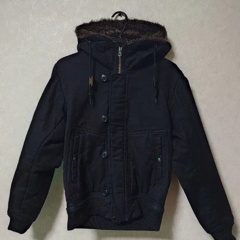 BEAMS의 올드 퍼가 달린 후드와 단추식 디자인이 특징인 블랙 점퍼. 밀리터리 자켓 플라이트 자켓