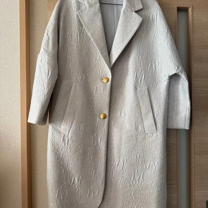 엠보싱 가공된 라이트 그레이 코트, 골드 버튼 포함.