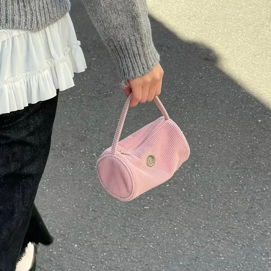 minitmute (미닛뮤트)의 코듀로이 소재 핑크색 원통형 핸드백.