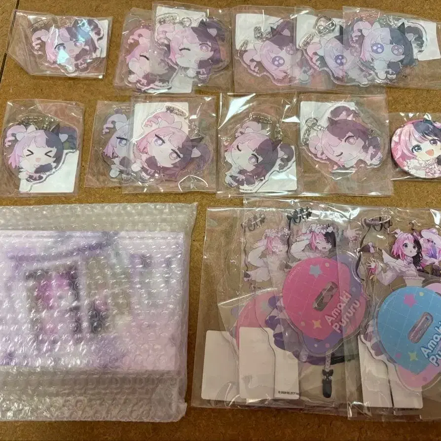 아크릴 키링 11개 캔뱃지 1개 아크릴 블록 1개 아크릴 스탠드 3개 총 16개 세트입니다. 미개봉 새상품 묶음 판매 우선이지만 낱개 판매도 검토합니다. 가격이 비싸지지만 원하시면 댓글 주세요.