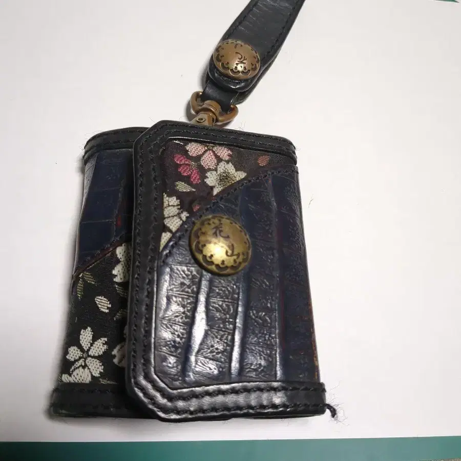 네이비 색상의 가죽과 꽃무늬 콤비네이션, 골드 컬러 버튼 클로징이 있는 키케이스. - 색상: 네이비 - 디자인: 꽃무늬와 크로커다일풍 콤비네이션 - 브랜드명: 카잔 (花山) - 클로징: 골드 컬러 버튼식 클로징 - 소재: 가죽 방문해 주셔서 감사합니다. 컬러 - 블랙 계열 얼룩, 찢김, 냄새 등 - 없음