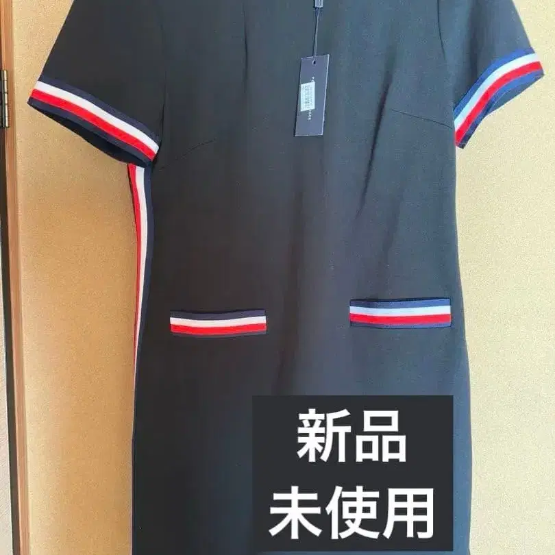 스트라이프 악센트가 특징인 블랙 원피스, 앞면에 포켓이 있어 편리합니다.