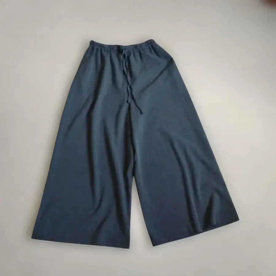 미즈이로 인드 와이드 크롭 팬츠입니다. 사용감이 적은 새상품급입니다. 사이즈 M 허리 밴딩 64~84 밑위 39 인심 56 차콜 그레이 안감 없음