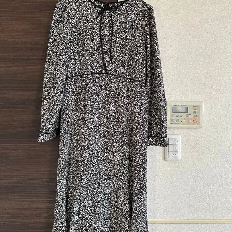 블랙과 화이트 꽃무늬 롱 원피스, 리본 포함된 넥라인으로 엘레강트한 인상.