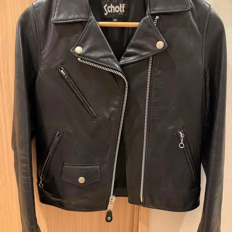 블랙 색상의 가죽 더블 라이더 자켓, XS 사이즈, 스타일리시한 디자인.