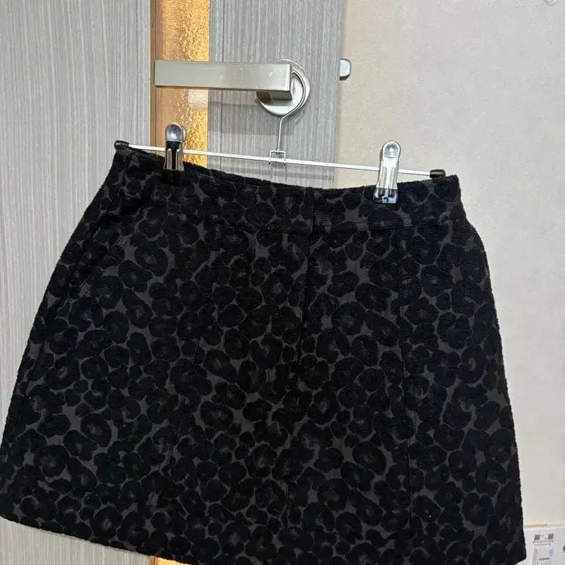 에이미 이스트 월의 레오파드 무늬 미니 스커트입니다. 사이즈는 S 2회 착용했습니다. 보풀이 잘 생기는 소재로, 니트와 마찰되어 윗부분에 니트의 보풀?이 약간 묻어 있습니다.