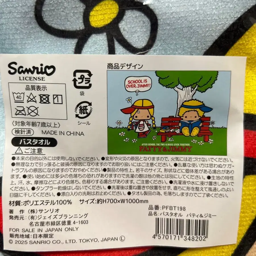 Sanrio의 PATTY & JIMMY 디자인 폴리에스테르 타월, 사이즈 700mm x 1000mm. - 브랜드: Sanrio - 디자인: PATTY & JIMMY - 소재: 폴리에스테르 100% - 사이즈: 700mm x 1000mm - 제조국: 중국산 방문해 주셔서 감사합니다.