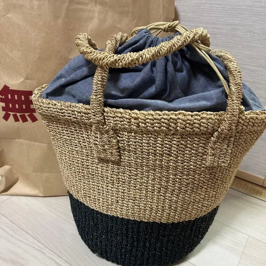 베이지와 블랙 스트라이프 디자인의 바스켓백, 드로우 스트링이 있어 사용하기 편리합니다.