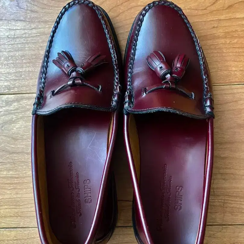 버건디 색상의 태슬 장식 슬립온입니다. 사이즈는 US 7 (일본 사이즈 약 24.5cm)입니다. 평소 24.5cm를 신는데, 아쉽게도 역시 작아서 포기했습니다. 사진에서 보시는 것처럼 상태도 매우 좋고 거의 새 상품입니다. 밑창도 가죽으로 상태가 좋습니다.