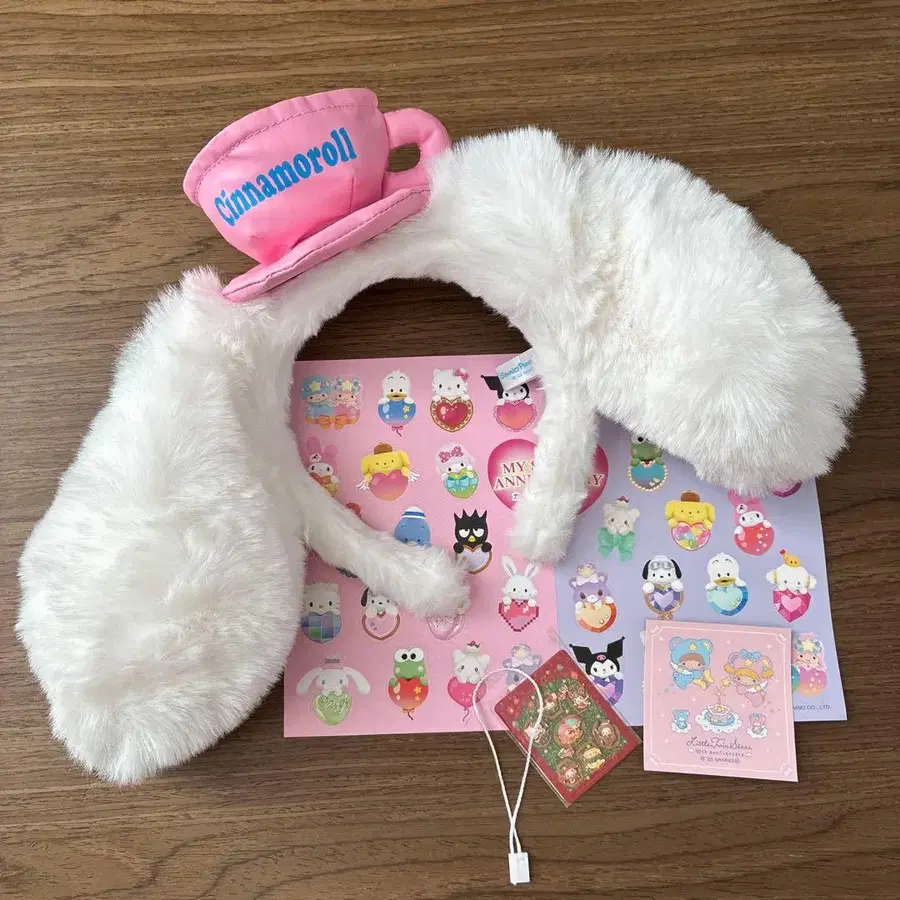 시나모롤 귀 달린 머리띠, 인조 모피 소재로 귀여운 디자인. - 디자인: 시나모롤 귀 달린 머리띠 - 색상: 화이트와 핑크 - 소재: 인조 모피 - 특징: 머리띠에 핑크색 모자 부착 - 부속품: 씰 시트와 카드 방문해 주셔서 감사합니다. 산리오 시나몬 롤
