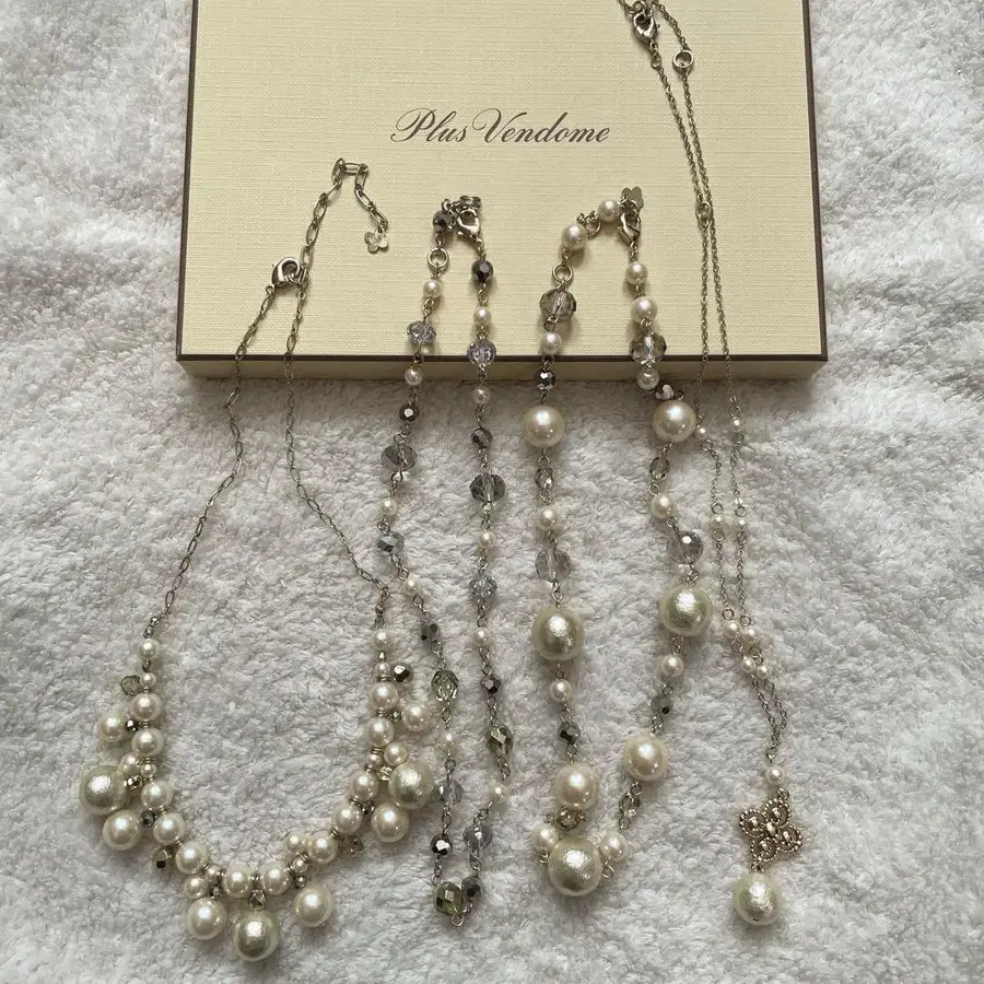 플러스 반돔(Plus Vendome)의 타르트 클로버(TARTE CLOVER) 목걸이 4개 세트입니다. 여러 개를 함께 착용하여 다양하게 연출할 수 있습니다. (사진 7장 참조) 2015년경 구매했으며, 1회 사용 후 자택에서 보관했습니다. 박스 있습니다. 자택 보관품임을 이해하신 후 구매 부탁드립니다.