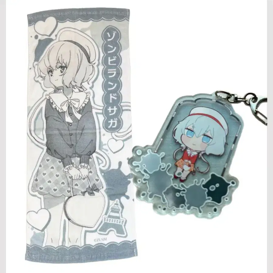 좀비랜드 사가 도쿄 타워 콜라보 콘노 준코 페이스 타월 아크릴 키링 2개 세트입니다. 아크릴 키링은 확인을 위해 개봉 후 바로 봉투에 넣었습니다. 타월은 미개봉입니다.