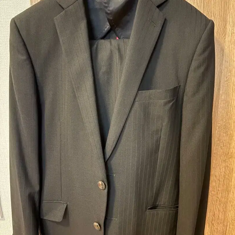 다크 브라운 스트라이프 디자인의 비즈니스 정장, 허리 80cm, 모와 폴리에스테르 혼합 소재. - 색상: 다크 브라운 - 사이즈: 78 (허리 80cm) - 소재: 모 50%, 폴리에스테르 50% - 디자인: 스트라이프 - 포켓: 가슴 포켓 있음. 방문해 주셔서 감사합니다. 하르야마에서 구매한 셋업 수트입니다. 학생 시절에 사용했으며 더 이상 입지 못하게 되어 판매합니다. 눈에 띄는 흠집이나 얼룩은 없지만, 자켓 안쪽에 이름 자수가 있습니다. 중고품이므로 양해 부탁드립니다.