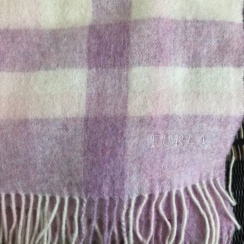 퍼플 계열의 체크 무늬, 울 혼방 FURLA 머플러. - 브랜드: FURLA - 색상: 퍼플 계열 - 디자인: 체크 무늬 - 소재: 울 혼방 - 프린지: 있음 방문해 주셔서 감사합니다.