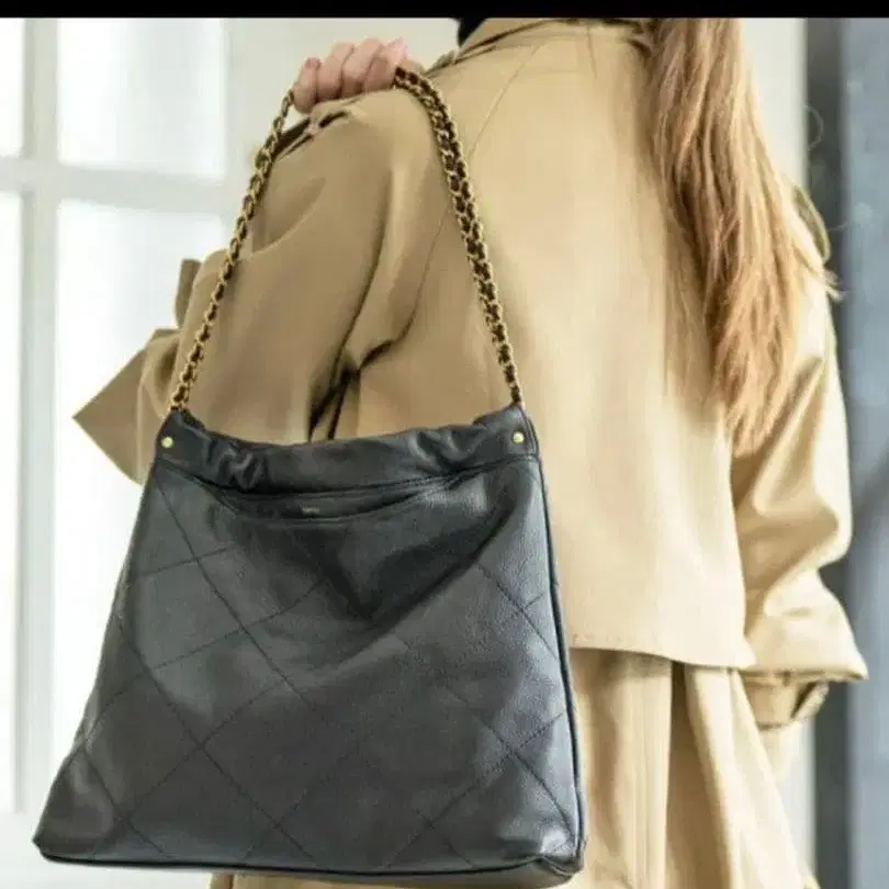 퀼팅 디자인의 블랙 숄더백, 체인 스트랩이 있어 캐주얼한 스타일에 최적입니다.