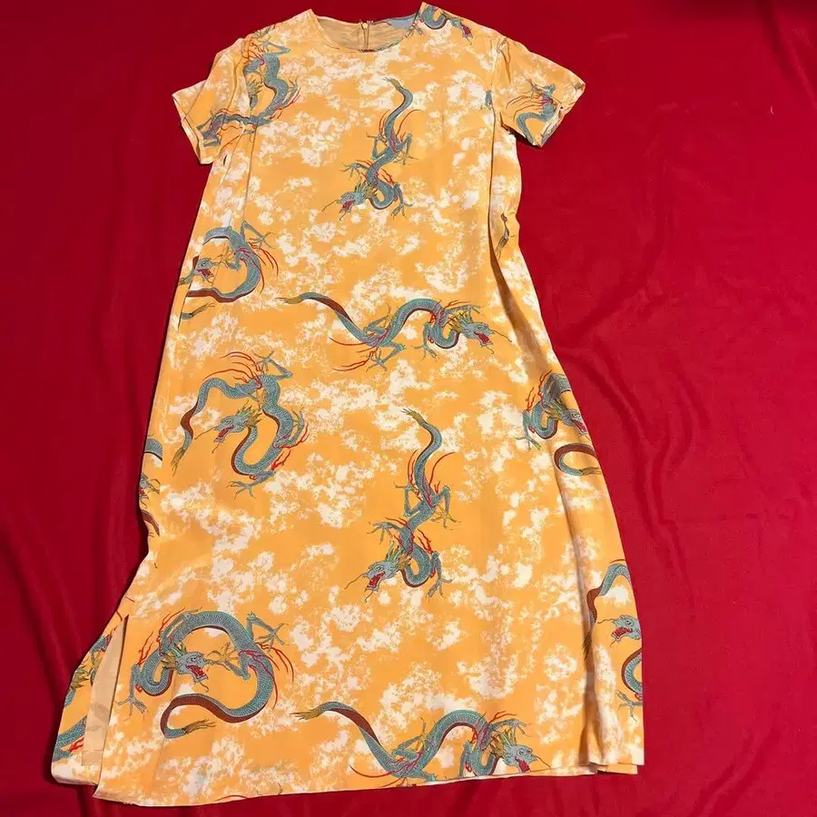 드래곤 패턴의 오렌지 컬러 맥시 원피스, 라운드넥과 숏 슬리브 디자인. - 색상: 오렌지 - 디자인: 드래곤 패턴 - 스타일: 맥시 원피스 - 넥라인: 라운드넥 - 슬리브: 숏 슬리브 방문해 주셔서 감사합니다. 구제 의류임을 양해 부탁드립니다. 사이즈 - FREE SIZE