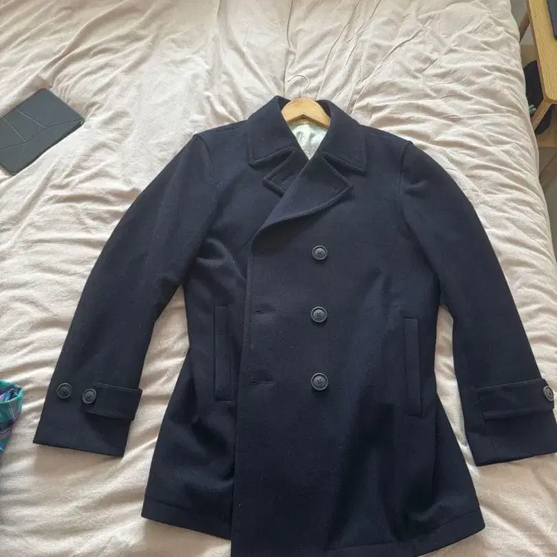 MUJI 네이비 더블 브레스트 피 코트, 사이드 포켓과 화이트 컬러 안감 부착.