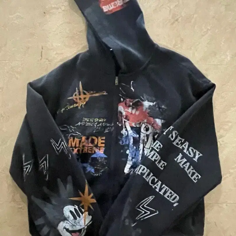 MADEEXTREME의 그래픽 디자인 후드티입니다. 약 반년 전에 온라인으로 구매하여 방에 행거에 걸어 보관했습니다. 밖에서는 착용하지 않았습니다.